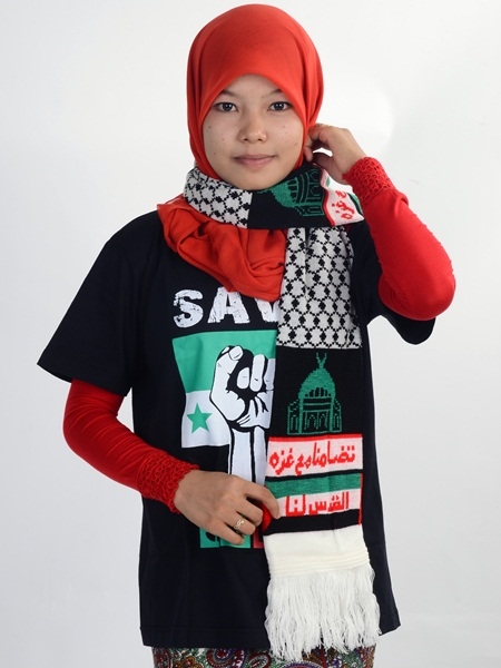 Ini adalah Proses percetakan pada mafla sedang dilakukan menggunakan teknik silkscreen. Kebiasaannya kain yang telah dipotong akan dicetak dahulu sebelum proses jahitan dilakukan.
